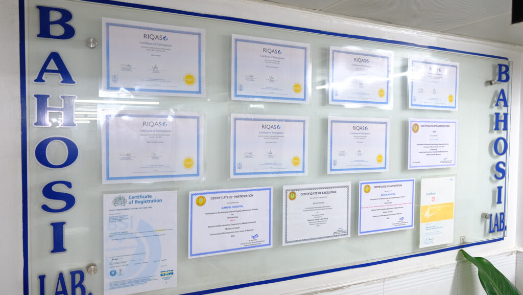-မြန်မာနိုင်ငံ အမျိုးသား ဓါတ်ခွဲစစ်ဆေးဌာနချုပ် National Health Laboratory (NHL) ၏ QC System များတွင် တစ်နှစ်ပါတ်လုံး ပါဝင်ဆောင်ရွက်၍ ရလာဒ်ကောင်း Certificate များစွာ ရရှိထားသော နာမည်ရဓါတ်ခွဲခန်းတစ်ခုအဖြစ် ရပ်တည်လျက်ရှိပါသည်။ “လူသားအားလုံးကျန်းမာစေချင်သည် ဗဟိုရ်စည်” ဟူသောမိခင်ဆေးရုံ၏ ရည်ရွယ်ချက်အတိုင်း ပြည့်မီမှုရှိစေရန်အတွက် အကောင်းဆုံးကြိုးစားဆောင်ရွက်လျက်ရှိပါသည်။